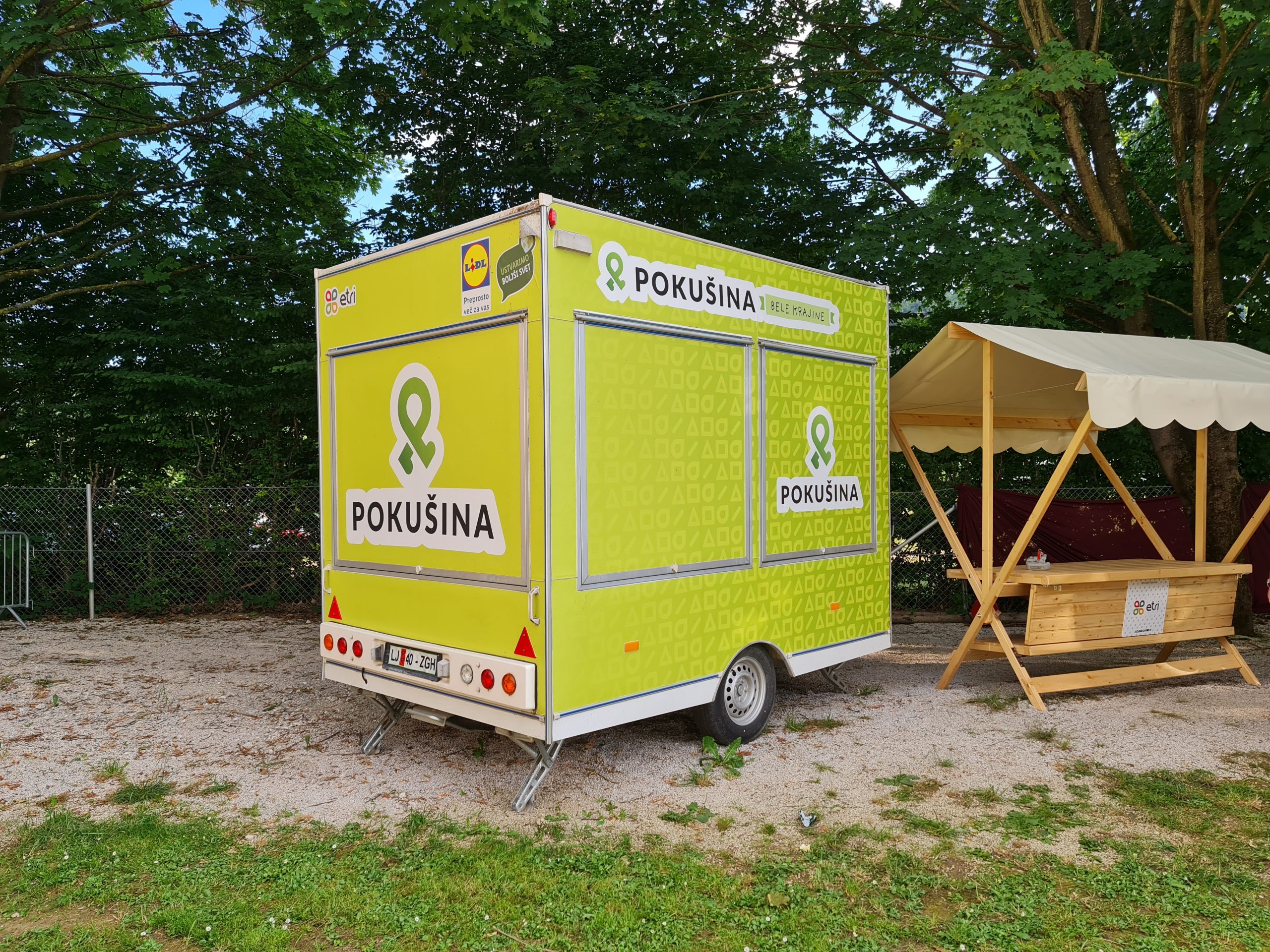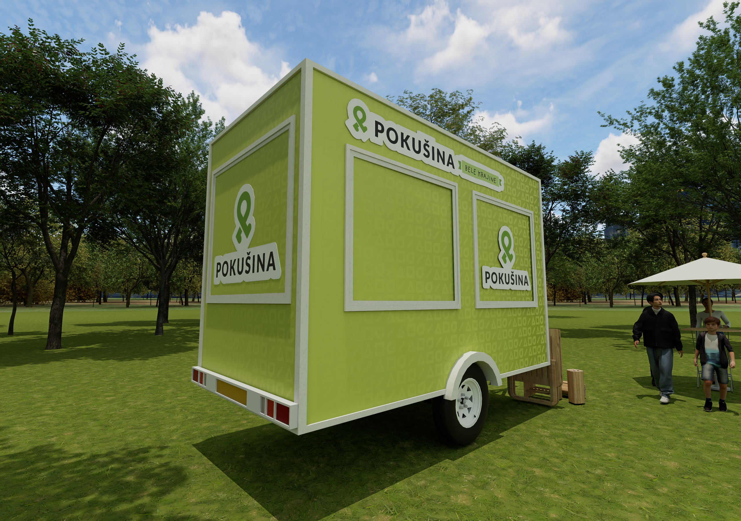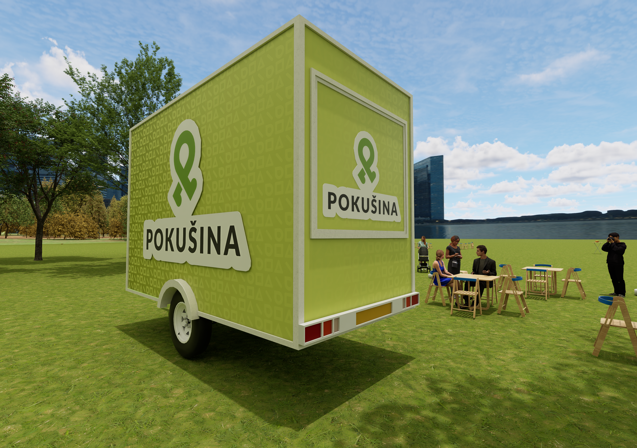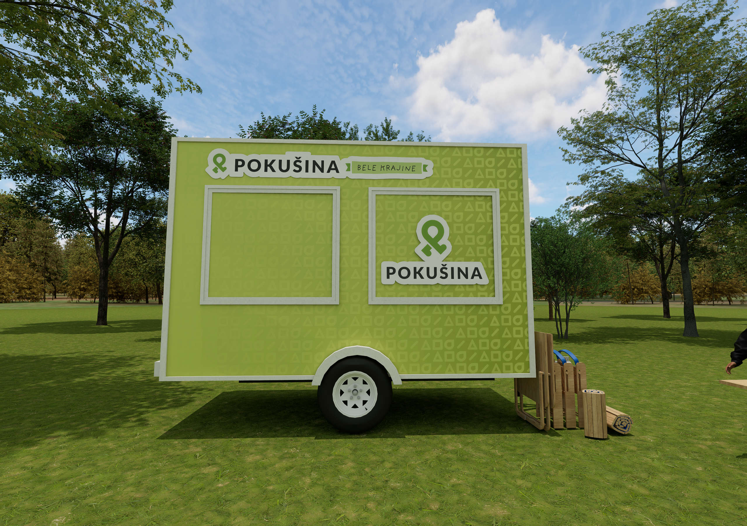I designed a visual identity that includes the development of a logotype and symbol in primary and secondary positioning, with and without a tagline. The tagline is unique in its flexibility — with each new region the trailer visits, the tagline changes, reflecting its movement and local connections. The tagline is therefore designed as a separate sticker that can be easily replaced. Typographic guidelines and a color palette were also defined, and a playful mascot was designed to visually connect all the elements. A series of stickers was also prepared for labeling and decorating the trailer.